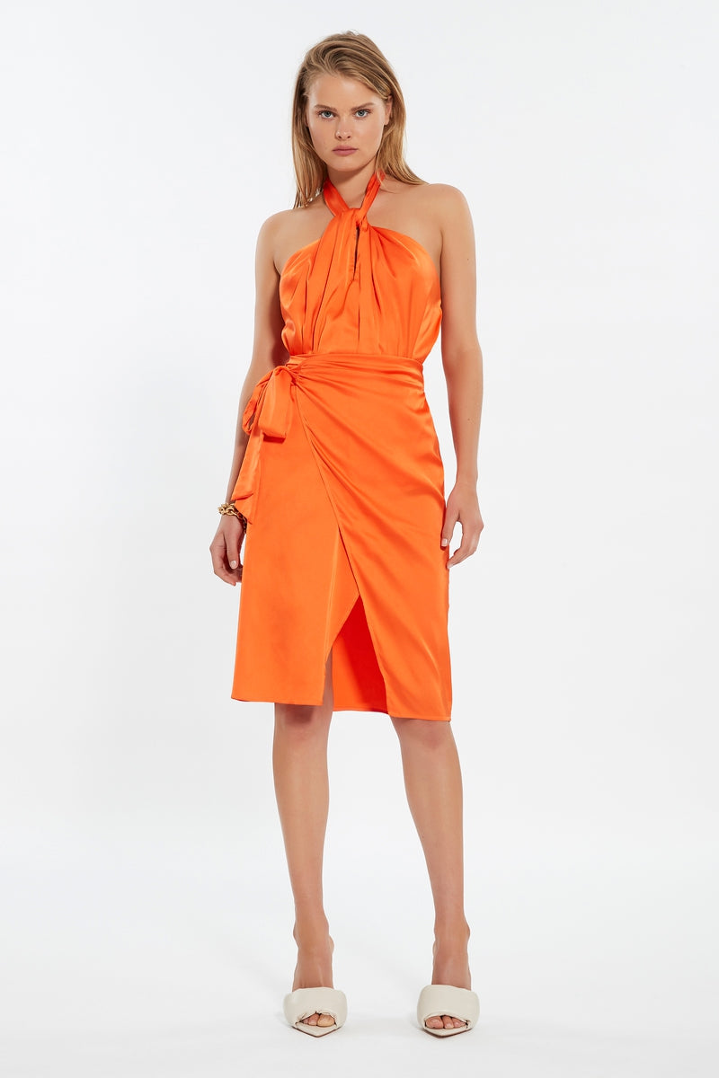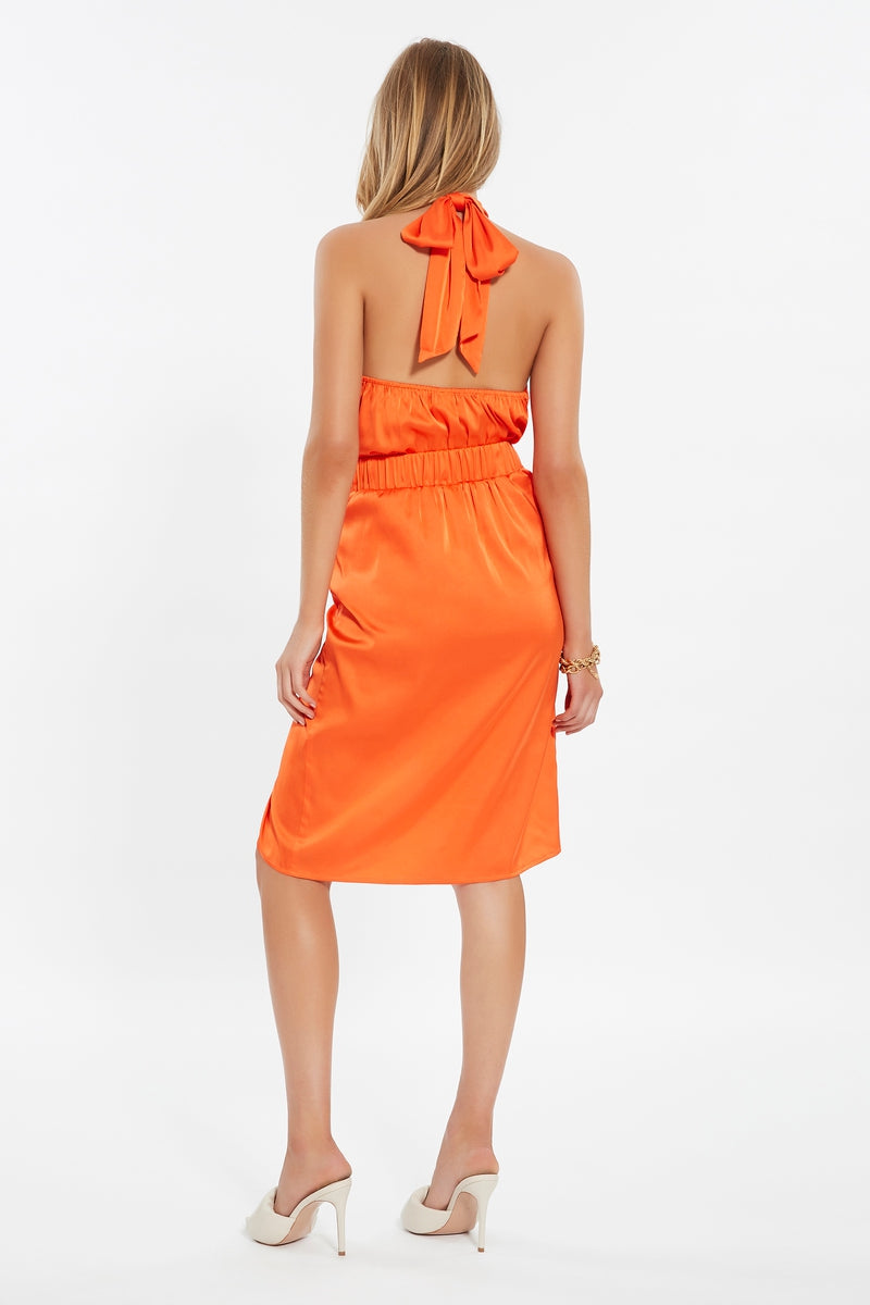Meet our Abigail, she is the perfect set for any occasion. Abigail comes in two different colours: inject a shot of vitamin D into your wardrobe this season with our deep signature orange satin or showcase the white version for a classic look. Sweep your hair back to showcase the sleek high neckline and shoulders.
