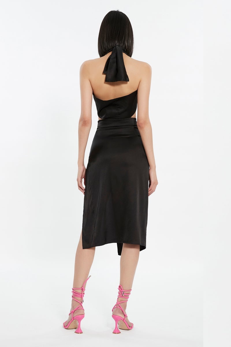 Beatriz demands attention from first glance. Crafted from gorgeous body-skimming fabric, she is everyone's summertime favourite. The neckline is a wrapped masterpiece. The halter neckline drapes down in large bands to create a resort-style bandeau and ties behind the neck. A drawstring on the skirt allows you to decide how much leg to show off.