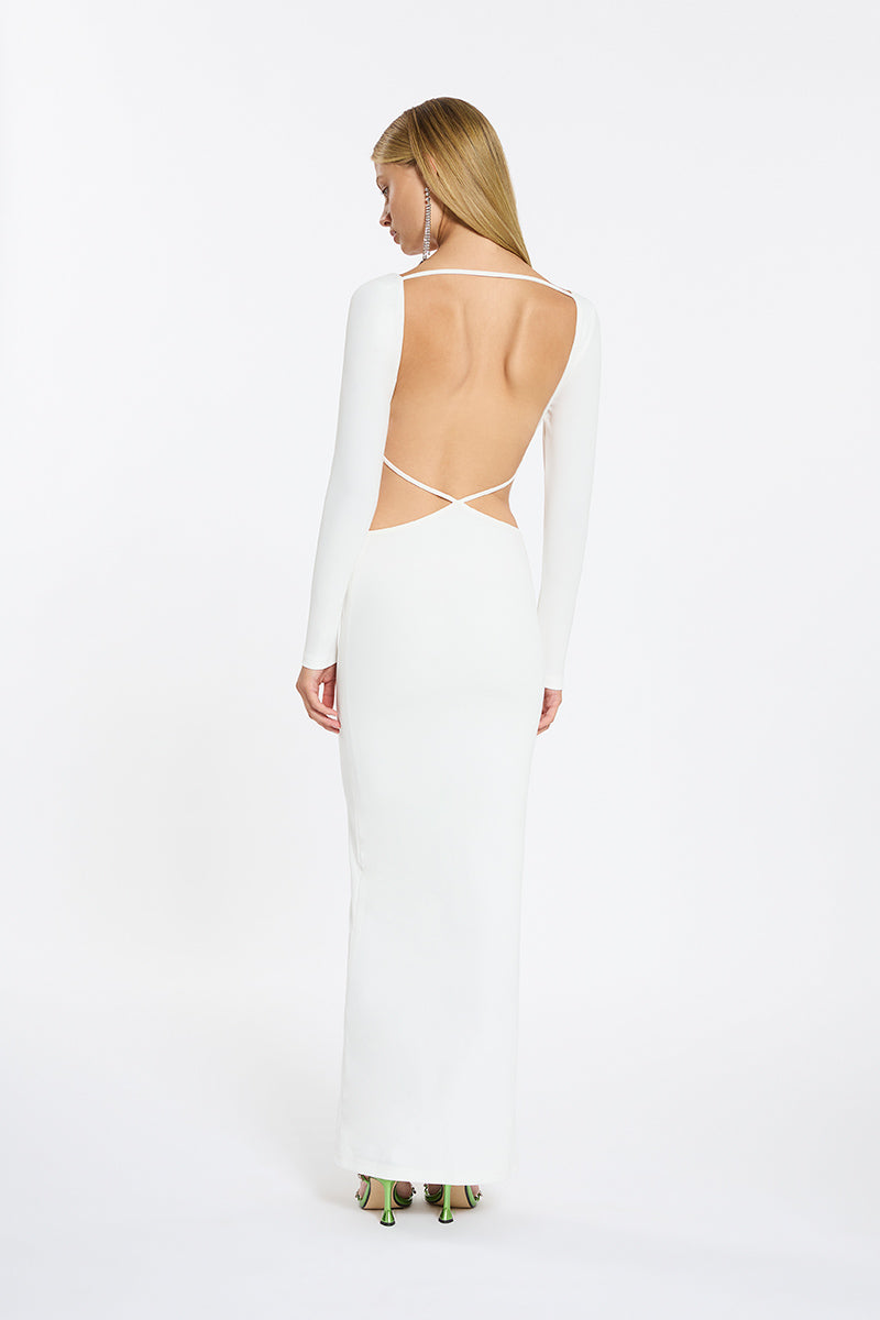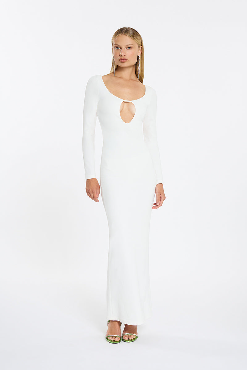 Delilah is an ultra-flowy gown in a thick marshmallow fabrication featuring a sharp, key-hole cutout at the central bust that compliments the spread of the ankle-length hem. Perfect for a glamorous night out or event.